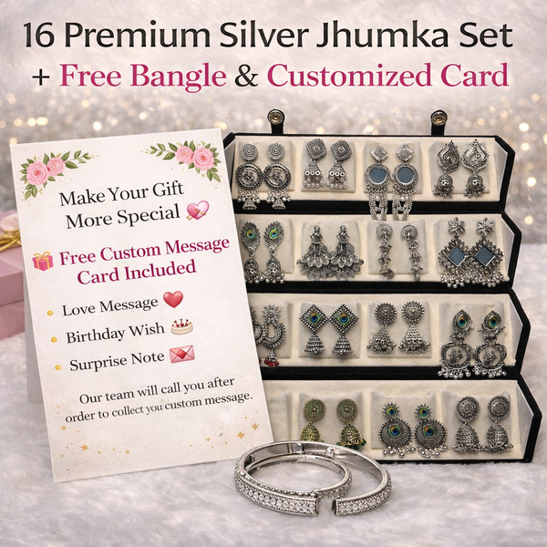 16 Premium Silver Jhumka Set with Free Bangle Gift (Luxury Gift Box)