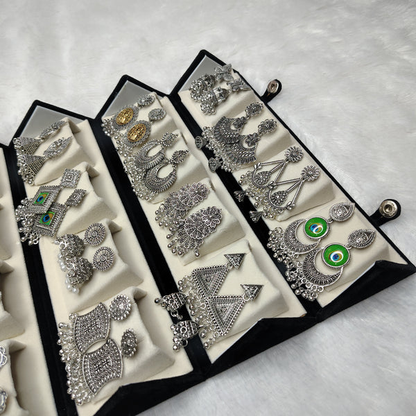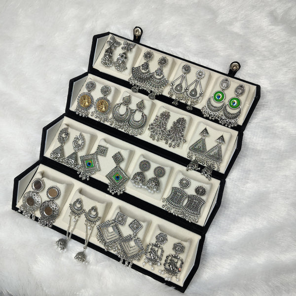 One box includes 16 beautifully crafted oxidised jhumka pairs, giving you a versatile collection that complements almost any outfit — from ethnic wear to casual styles. The 3-layer foldable jewelry box is the highlight of this set. It unfolds into a stylish stair-style display tray, making it easy to view, organize, and carry your earrings while adding a luxurious touch.